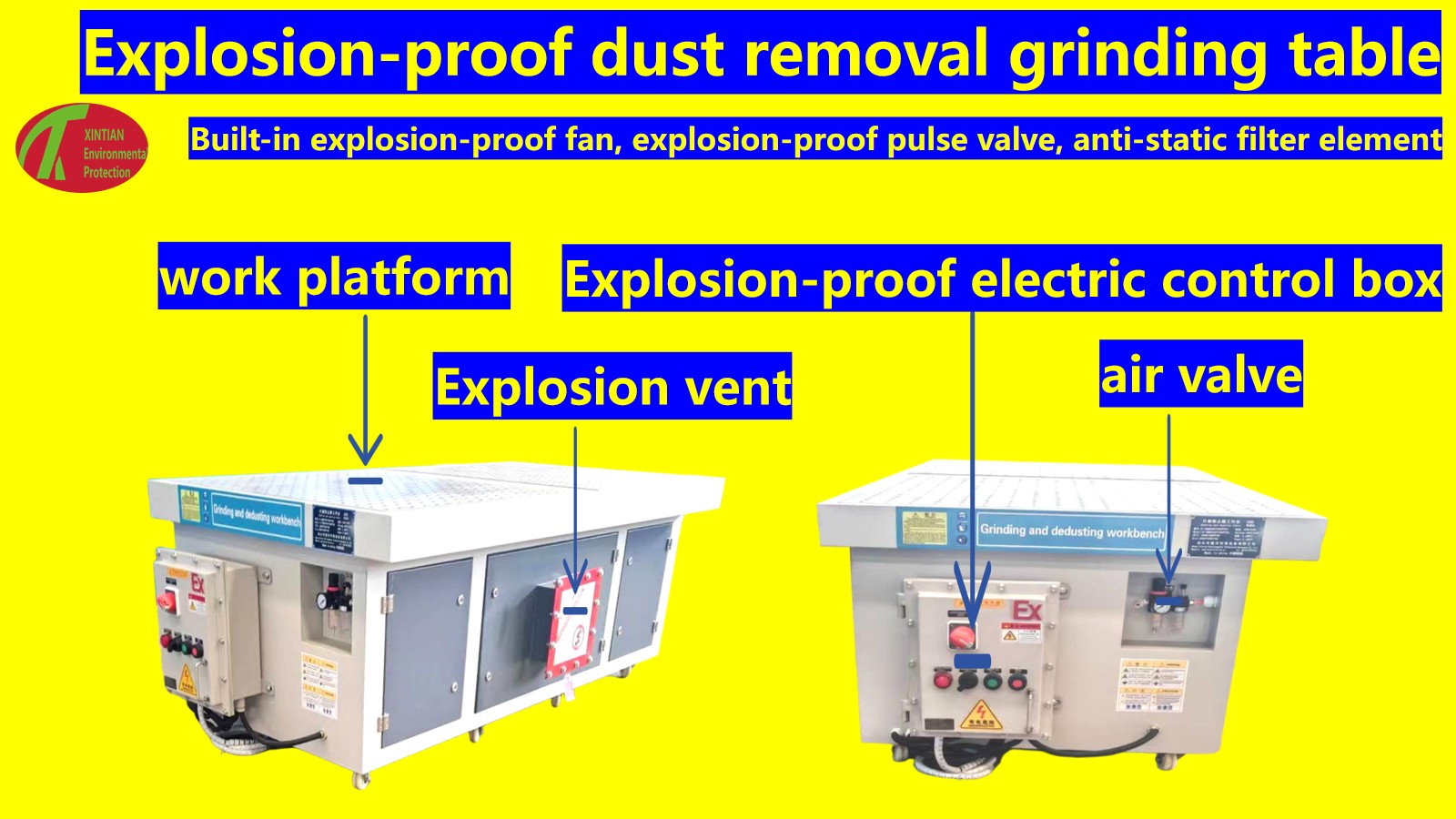 Khi mài, khởi động quạt. Dưới tác dụng của quạt, không khí gần cửa hút gió trên bàn và mặt bên của tấm đứng bị hút vào. Không khí chứa bụi đi vào khung qua cửa hút gió, không khí được hấp phụ và thu đều bởi hộp lọc. Hộp lọc lọc bụi trong không khí và không khí được lọc bằng cách thu gom bụi được thải vào khí quyển thông qua cửa thoát khí ở dưới cùng của khung.